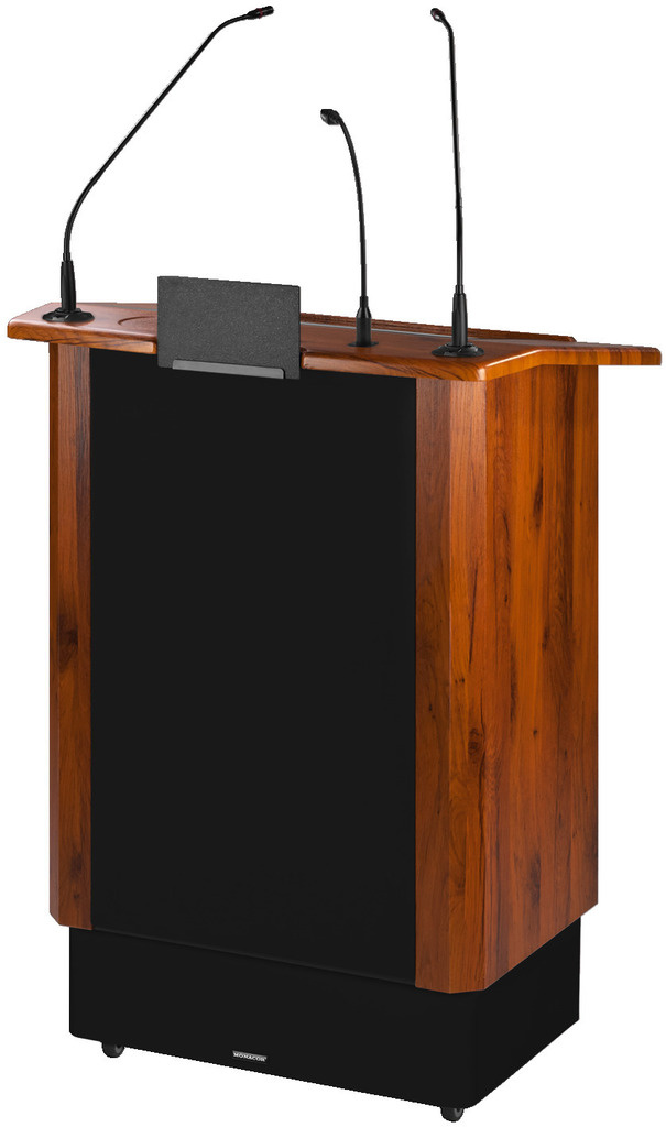 Profesionální pult s elektrickým nastavením výšky a integrovaným bezdrátovým systémem zesilovače. Vestavěný 4-kanálový zesilovač kombinován s omezovačem, 50 W. Variabilní elektrické nastavení výšky pultu 85 až 125 cm. Horní část pultíku s průhlednou bezpečnostní skleněnou deskou a osvětlenou přihrádkou pro notebook.